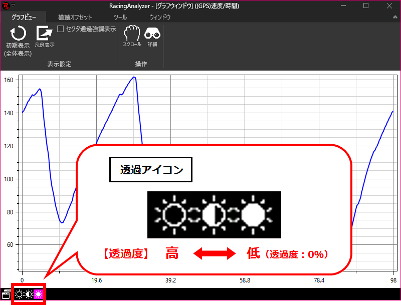 Racing Analyzer ツールタブより「半透明機能」をONにすることで、走行ログデータの解析時に使用する「データビュー」「トラックビュー」「グラフビュー」などの画面が透過表示できるようになります。
